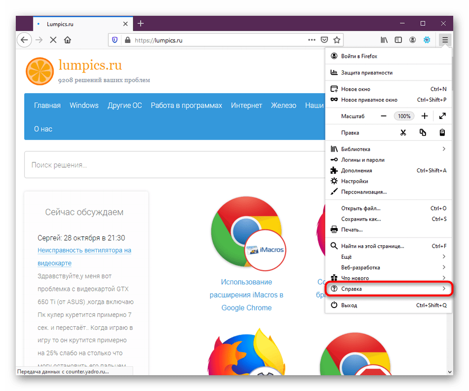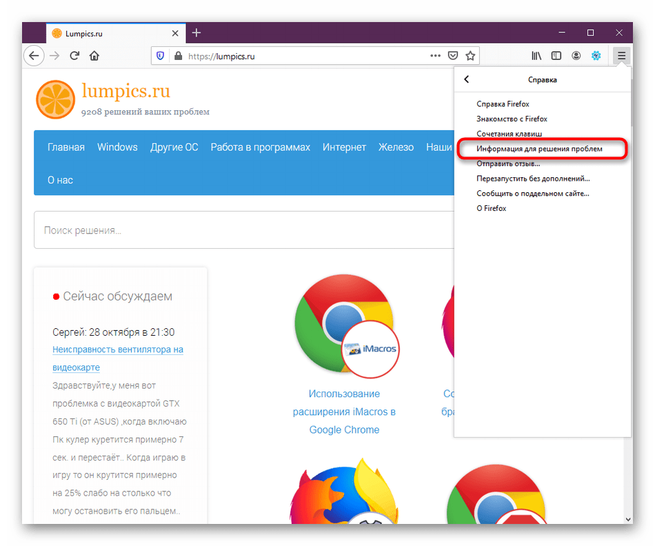 Завершающий этап, который подразумевает процесс восстановления старого профиля. Прежде всего, нам потребуется открыть папку с новым профилем. Для этого щелкните по кнопке меню браузера, выберите иконку с вопросительным знаком, а затем перейдите к пункту «Информация для решения проблем».