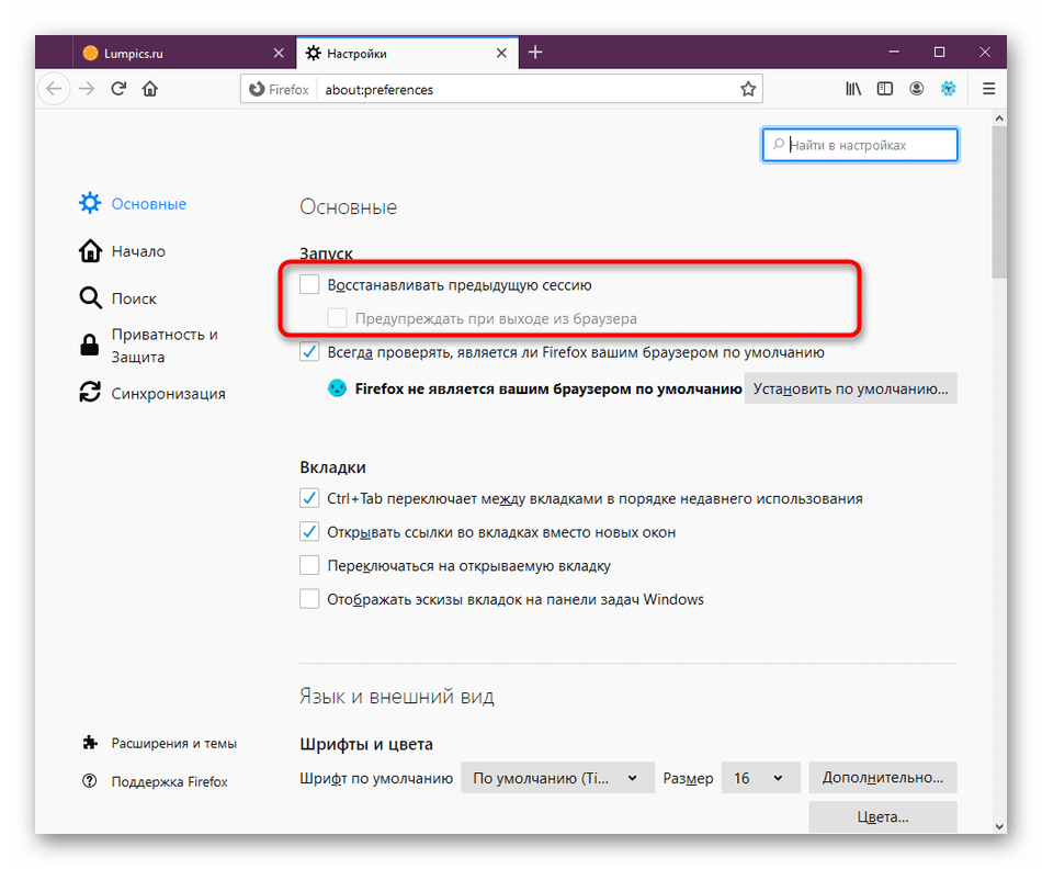 Мы уже говорили ранее, что восстановление предыдущей сессии по умолчанию автоматически возможно только при критических ошибках или непредвиденных перезапусках после установки обновлений. Если вы хотите, чтобы закрытые вкладки открывались сразу же, потребуется включить соответствующую функцию в настройках.