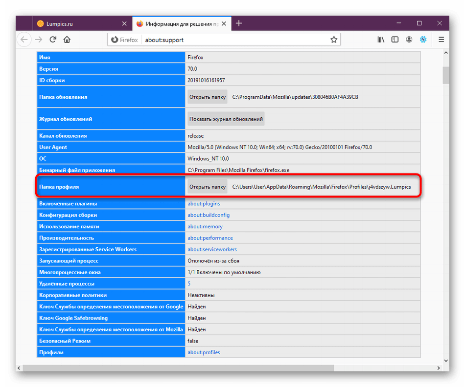 Опуститесь вниз по списку сведений и откройте папку профиля. Если нет возможности сделать это через браузер, запустите проводник и перейдите по пути C:Usersимя_пользователяAppDataRoamingMozillaFirefoxProfiles .