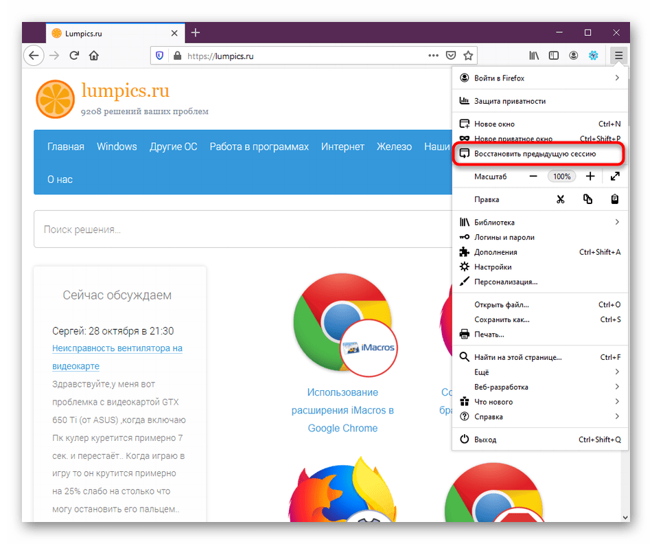 Способ 2: Кнопка «Восстановить предыдущую сессию»