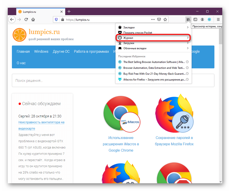 Давайте вкратце разберем случай, когда пользователь не хочет восстанавливать всю сессию целиком или просто желает посмотреть, что именно было в ней. В этом поможет встроенное меню под названием «Журнал», отображающее историю и позволяющее восстановить последние закрытые сайты, что осуществляется так: