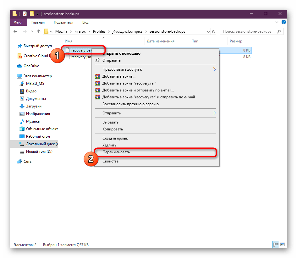 - Теперь кликните правой клавишей по файлу и нажмите на «Переименовать». Введите sessionstore.js и подтвердите переименование с заменой.