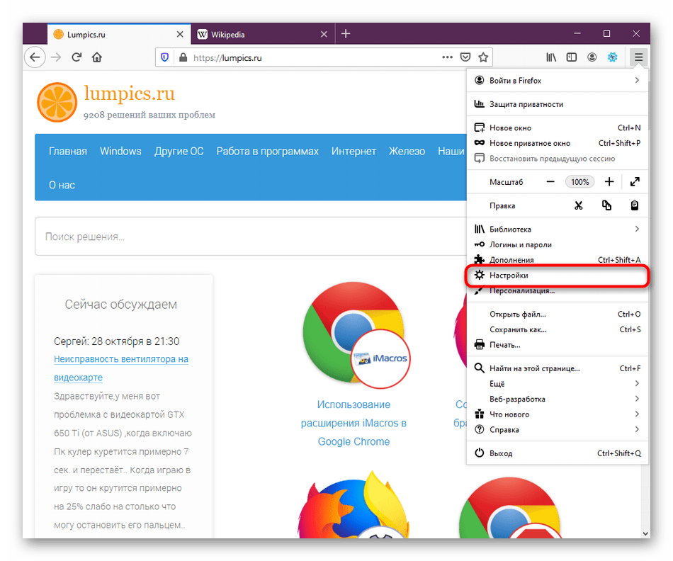 - В выпадающим списке (системное меню), находим пункт «Настройки»