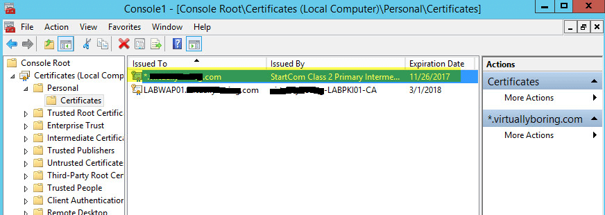 On AD FS Server: Scroll down to Personal > Certificates then right click the SSL certificate you used during setup of AD FS. Go to All Tasks > Export. Save to a location that your Web Application Proxy can access. Make sure you export the Private Key and certificate as a .pfx file format.