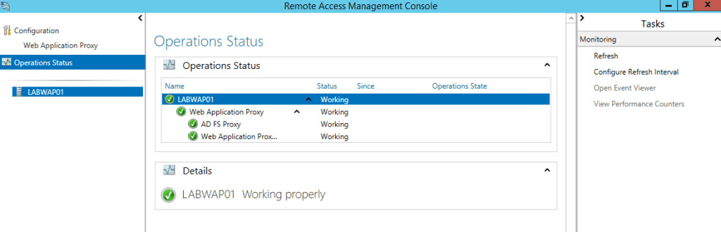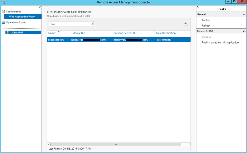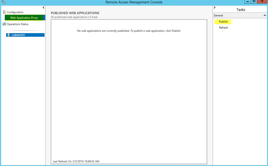 In the Remote Access Management console, in the Navigation pane, click Web Application Proxy, and then in the Tasks pane, click Publish.