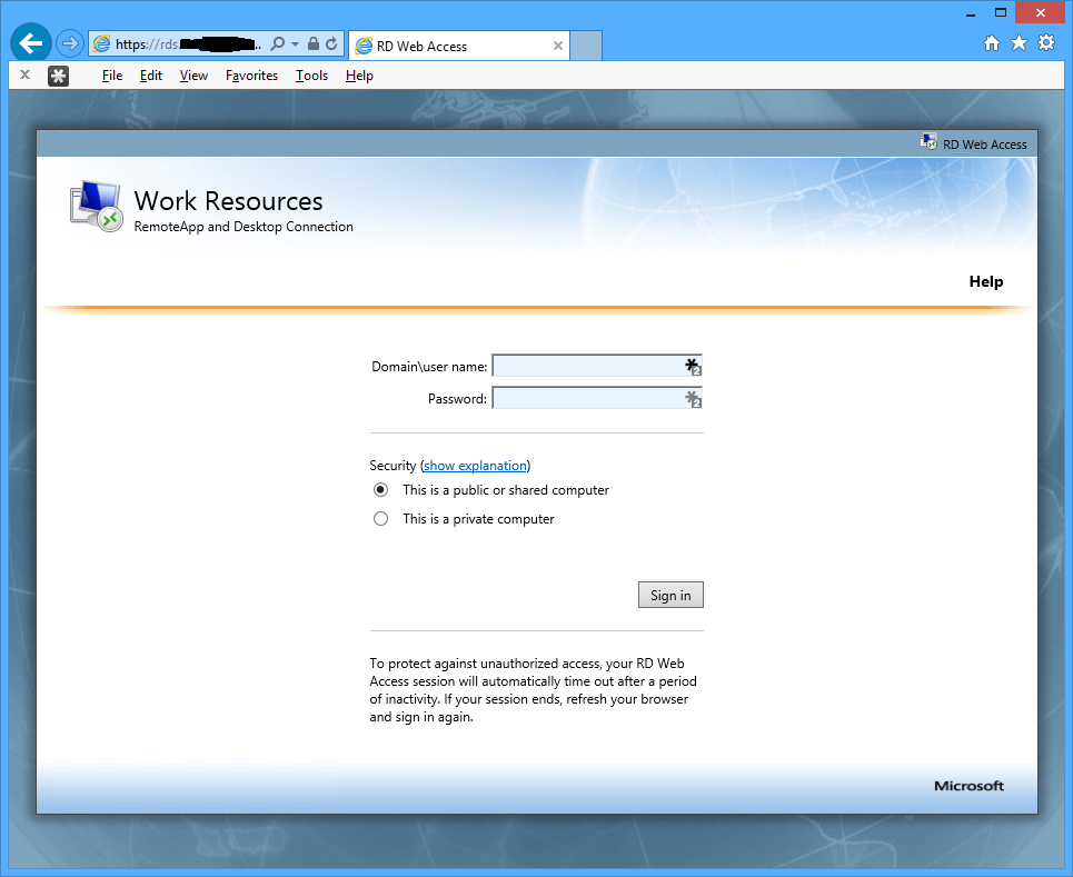 Then from the external network (for example on your smartphone or a PC) from home, try to access your web link like https://rds.techsupportpk.com and the following page will show up.