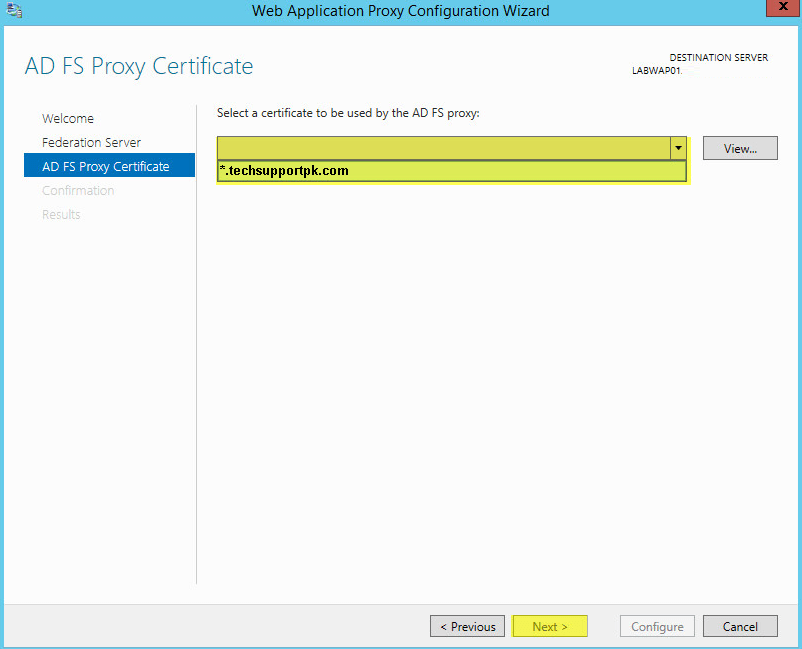 Web Application Proxy is now installed but you need the AD FS certificate to continue.