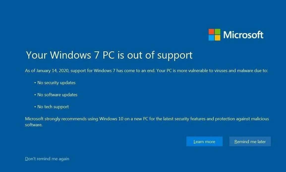 С января 2020 года у всех пользователей Windows 7 при включении компьютера появляется полноформатное окно со следующим текстом.