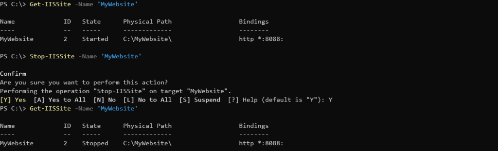 - Execute the cmdlet against the MyWebsite site. This cmdlet shuts down access to the website. Since this action is making operational changes you will be prompted for confirmation.