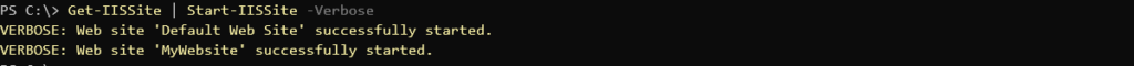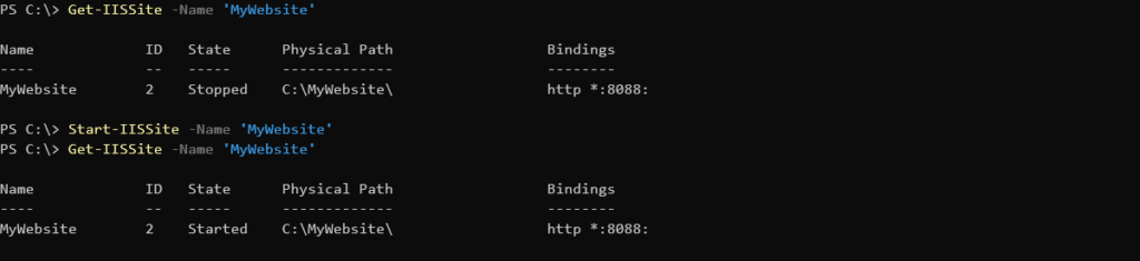 Let’s say you’ve made some changes to the MyWebsite site and need to start it back up again. It’s time to use the command. To do that, simply specify the name just as you did by using the cmdlet.