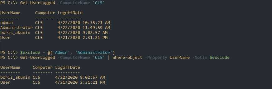 - Если вы выполняете команды типа ‘Invoke-Command’ (удаленные команды) — они тоже могут изменить файл ntuser.dat. То есть вы возможно захотите исключить часть пользователей из финального списка. Пример ниже.