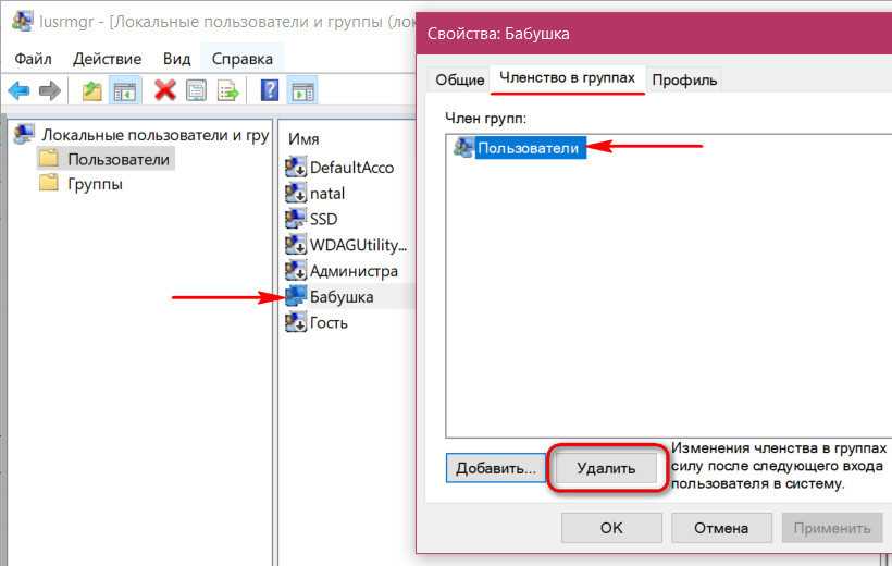 Затем делаем двойной клик на бабушкиной учётке и в окне свойств переключаемся на вкладку «Членство в группах». Удаляем группу «Пользователи».
