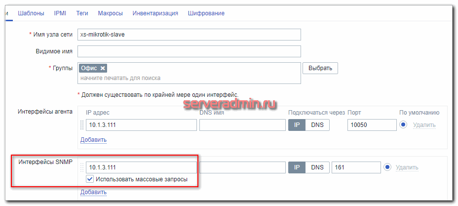 Мы включили snmp, выставили версию 2, разрешили подключаться только с ip адреса zabbix server — 10.1.3.29. Не забудьте указать адрес своего сервера.