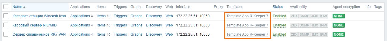 - Agent interfaces— адрес Zabbix-агента. Укажите здесь IP и порт с r_keeper_7, который вы хотите мониторить