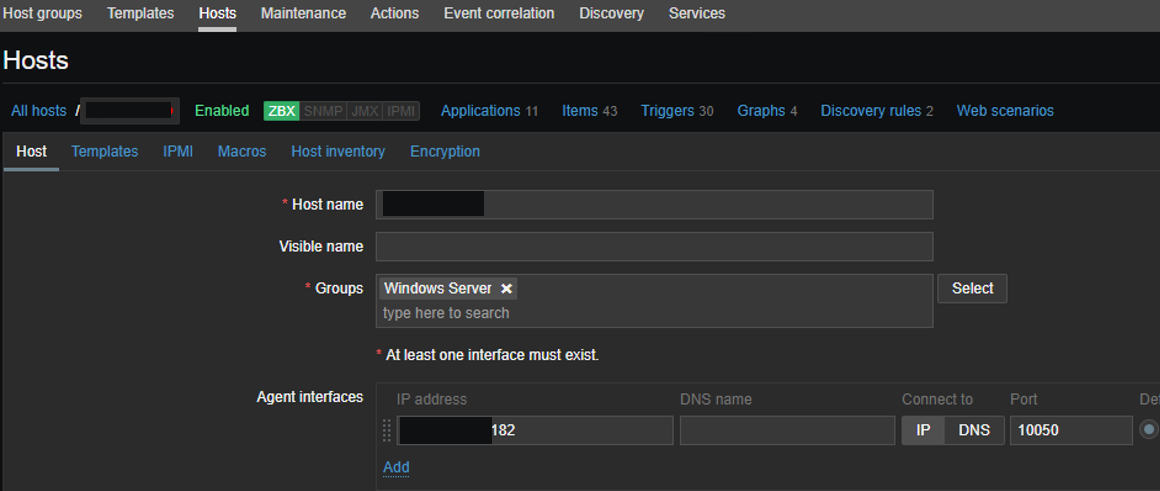 Enter a host name, select a group and enter an IP address of your host in Agent interfaces.