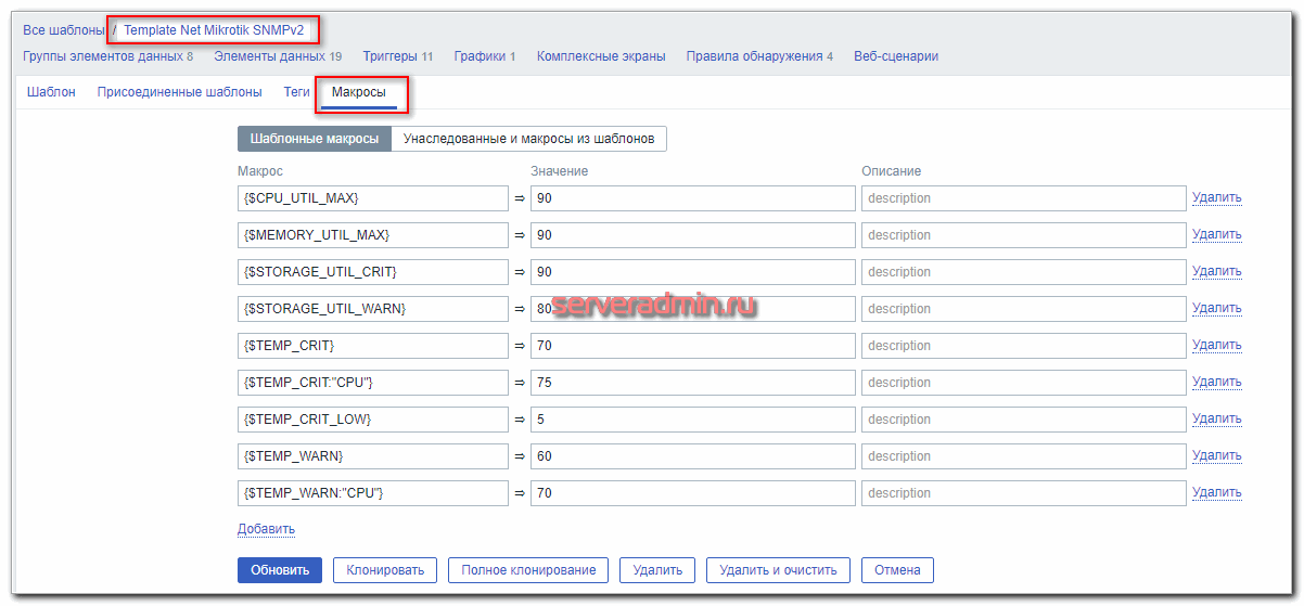 За основу мониторинга Mikrotik я возьму стандартный шаблон Zabbix от разработчиков. Он очень качественно сделан. Забирает информацию по snmp. Итемы и триггеры настраиваются через автообнаружение. Вот основные метрики, которые в нем реализованы: