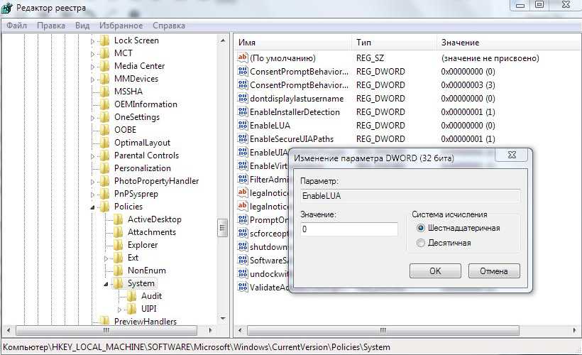 Дополнение к первому способу, которое позволит заходить в командную строку без прав администратора или даже выполнять команду сразу из окна «Выполнить». Нам нужно открыть редактор реестра, для этого зажимаем сочетание клавиш «Win+R», откроется окно «Выполнить», вводим туда команду «regedit». Двигаемся по пути HKEY_LOCAL_MACHINE/SOFTWARE/Microsoft/Windows/CurrentVersion/Policies/System, в этой папке ищем строку EnableLUA и меняем значение с 1 на 0. Для этого жмём правой кнопкой по строке и в контекстном меню выбираем пункт «Изменить». Впоследствии значение можно вернуть обратно и контроль учётных записей вернётся.