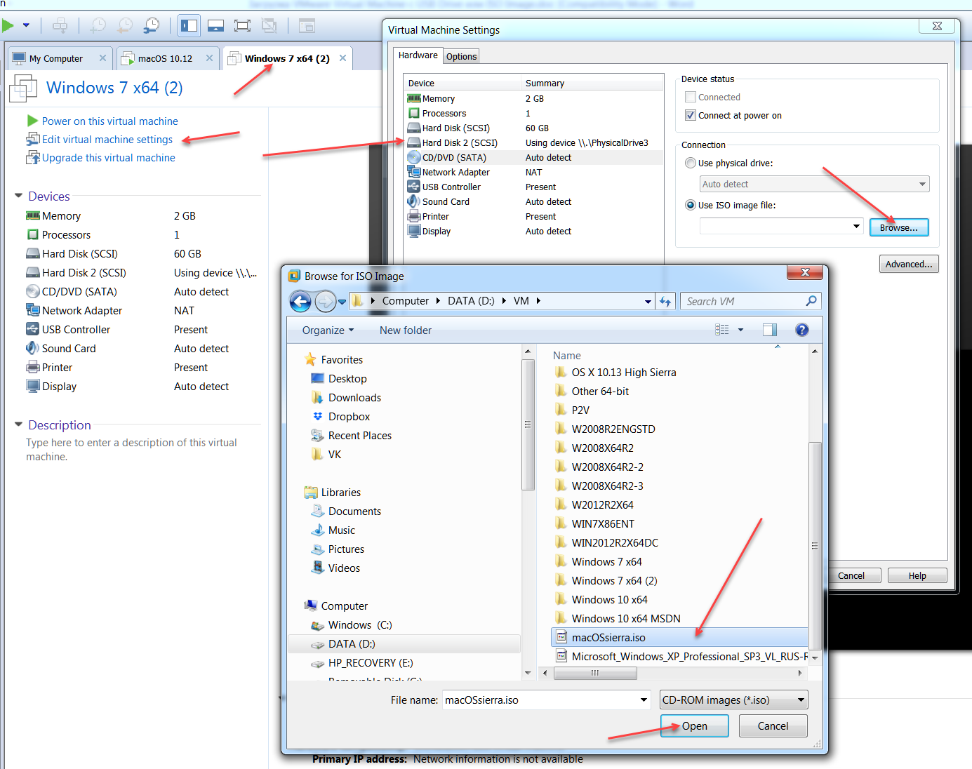 Шаг 5: Щелкните Browse… . Укажите на нужный вам образ ISO файла; выберите его и нажмите Open чтобы добавить этот образ к вашей виртуальной машине. Нажмите Finish и OK. Не забудьте отметить чек-бокс Connect at power on