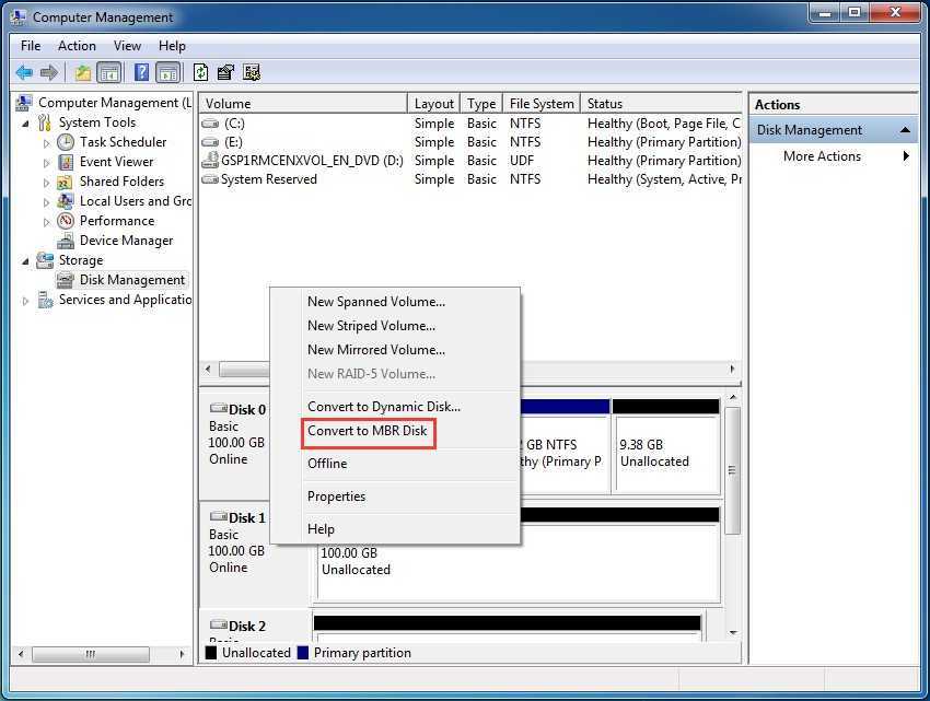 - Когда на диске становится незанятое место, щелкните на диск и выберите «преобразовать в MBR-диск » (Convert to MBR Disk). После этих шагов, оригинальный GPT диск будет преобразован в MBR диск, а затем вы можете перейти к установки Windows на этот диск.