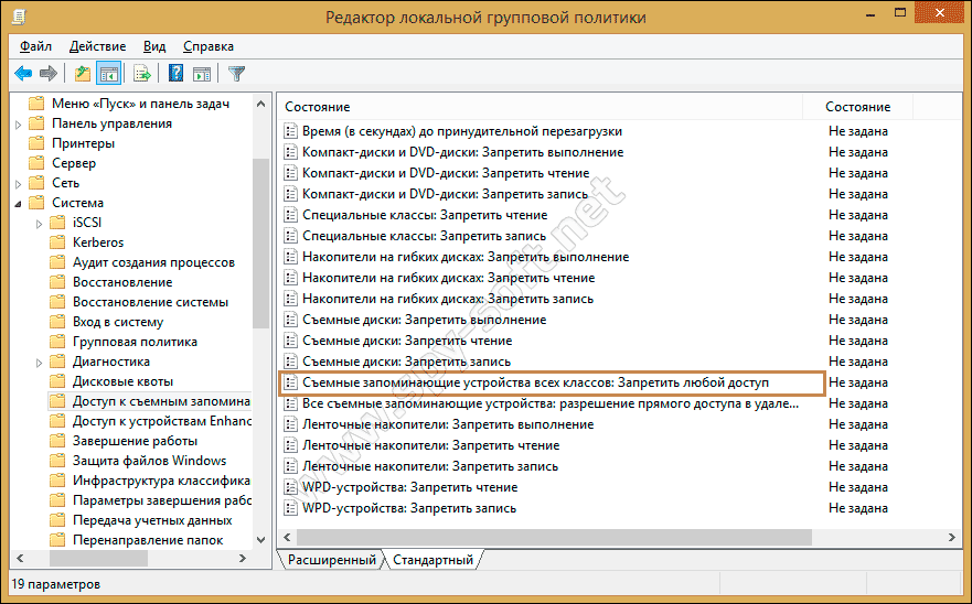 - Для того, чтобы в дальнейшем вновь включить возможность использования USB накопителей, просто удалите созданные параметры из реестра или установите «Выключено» в измененных ранее политиках доступа к съемным запоминающим устройствам.