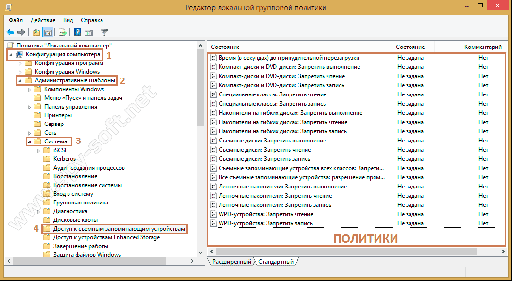 В данном случае нас интересуют политики касающееся съемных носителей. Однако здесь можно настроить работу с дисками (компакт, DVD, гибкими), ленточными накопителями и другими устройствами.
