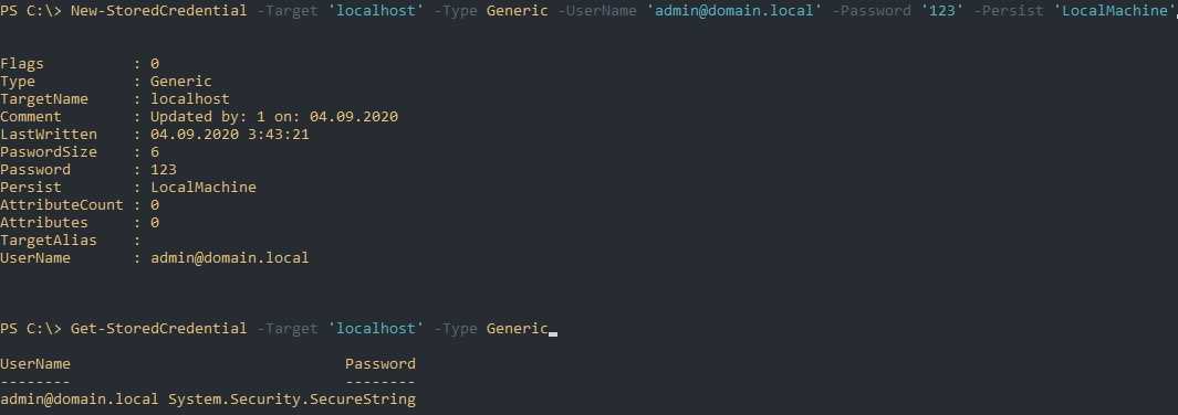 Мы получаем объект типа PSCredential, который мы можем использовать в командах. Создавать новые учетные данные и добавлять их в хранилище CredentialManager мы тоже можем: