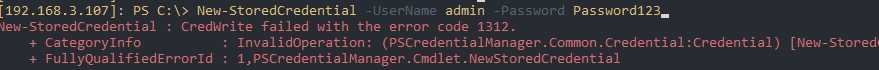 Так же у меня была ошибка ‘New-StoredCredential : CredWrite failed with the error code 1312’. Эта ошибка проявляет себя только в удаленных сессиях PSSession. Если вы работаете локально — то она не проявляется. Причина ошибки и ее решение — пока не ясно (нет ответа на github).