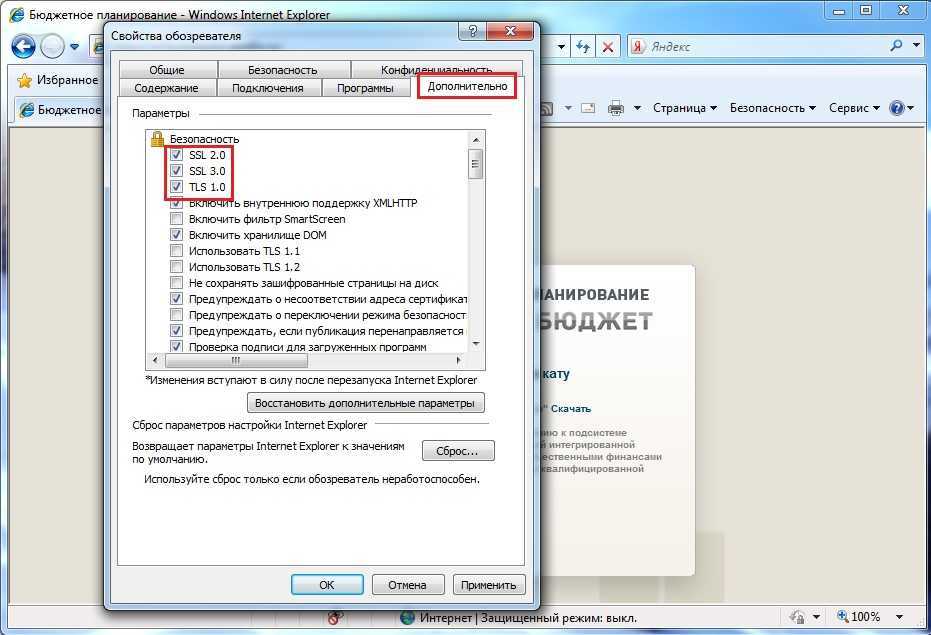 Если Вы дочитали до этого места и всё поняли, но не знаете, как включить TLS в IE, то это, по сути, уникальная ситуация. Но тем не менее. Для включения поддержки TLS старших версий необходимо зайти в меню Internet Options -> Advanced, там в списке промотать до раздела Security и сделать соответствующие изменения (как минимум отключить SSL 2.0 и включить TLS 1.1 и TLS 1.2, остальное – на усмотрение).