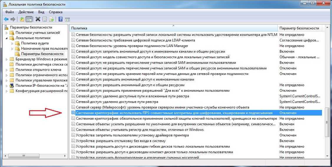 В соответствии с политикой в правой части окна, дважды щелкните Системная криптография: использовать FIPS-совместимые алгоритмы для шифрования, хеширования и подписывания